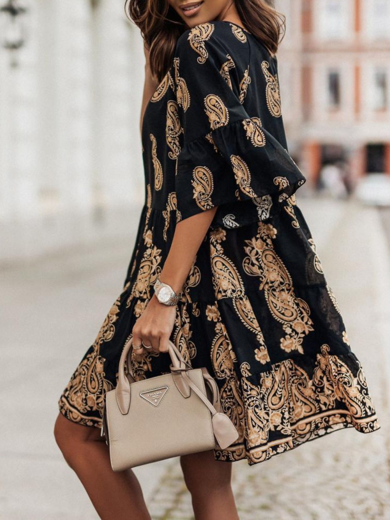 Paisley Print Tie Neck Half Sleeve Mini Dress