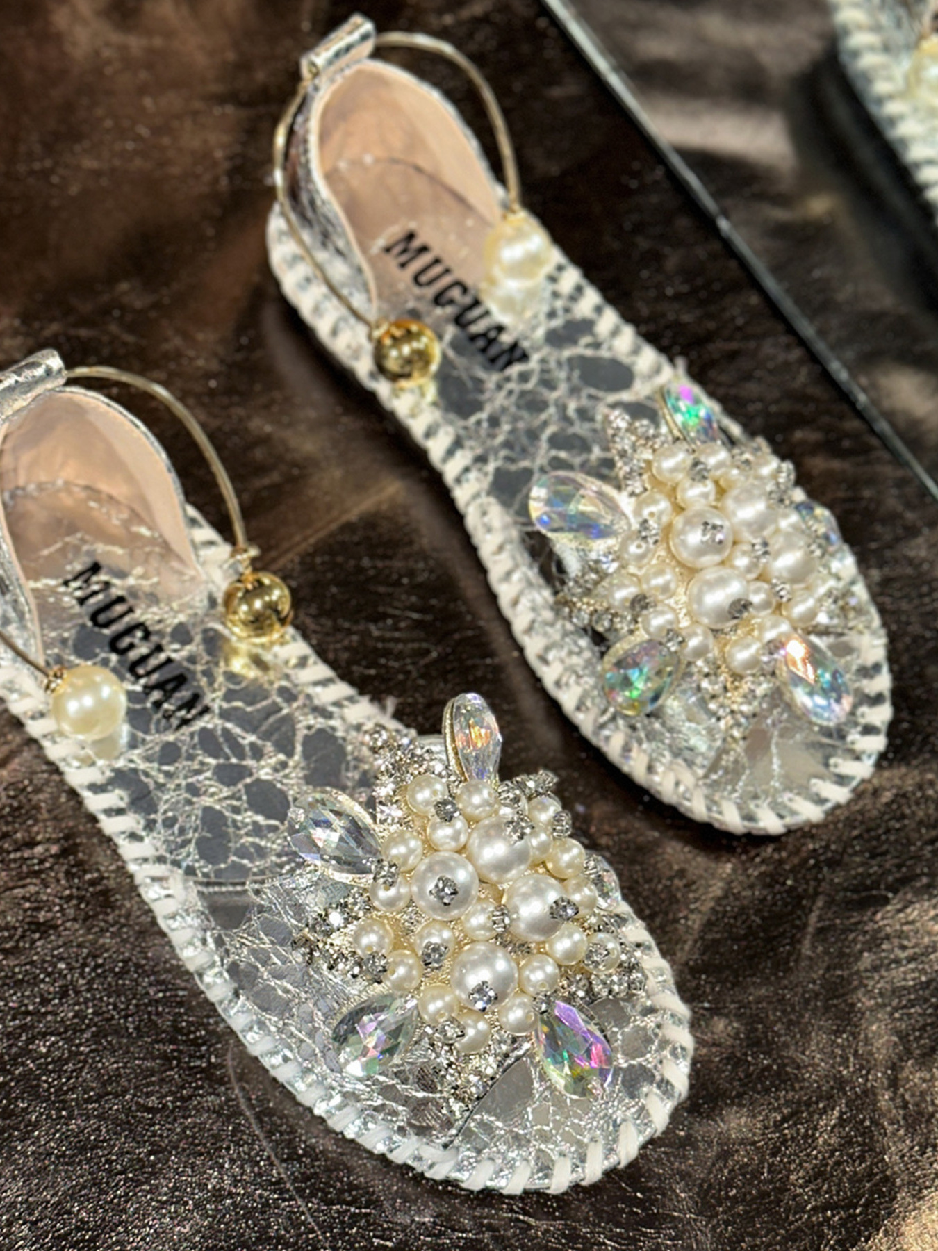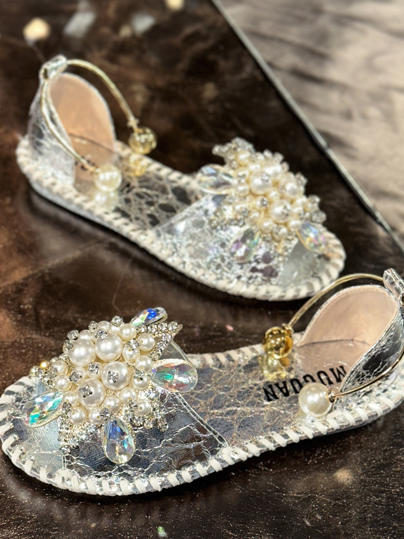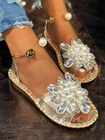 Pearl Crystal Embellished Flat Sandals