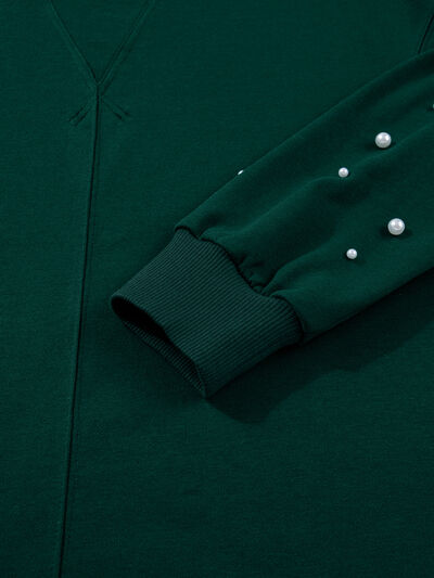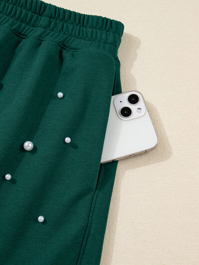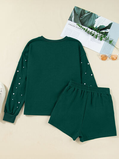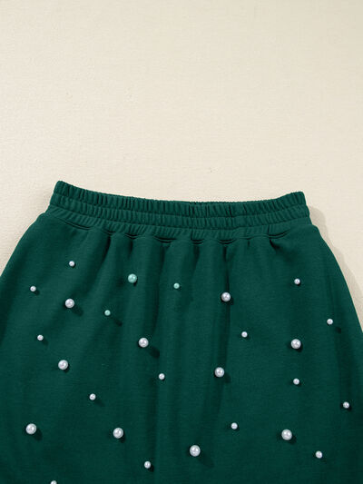 Pearl Embellished Drop Shoulder Pullover Elastic Waist Mini Skirt Set