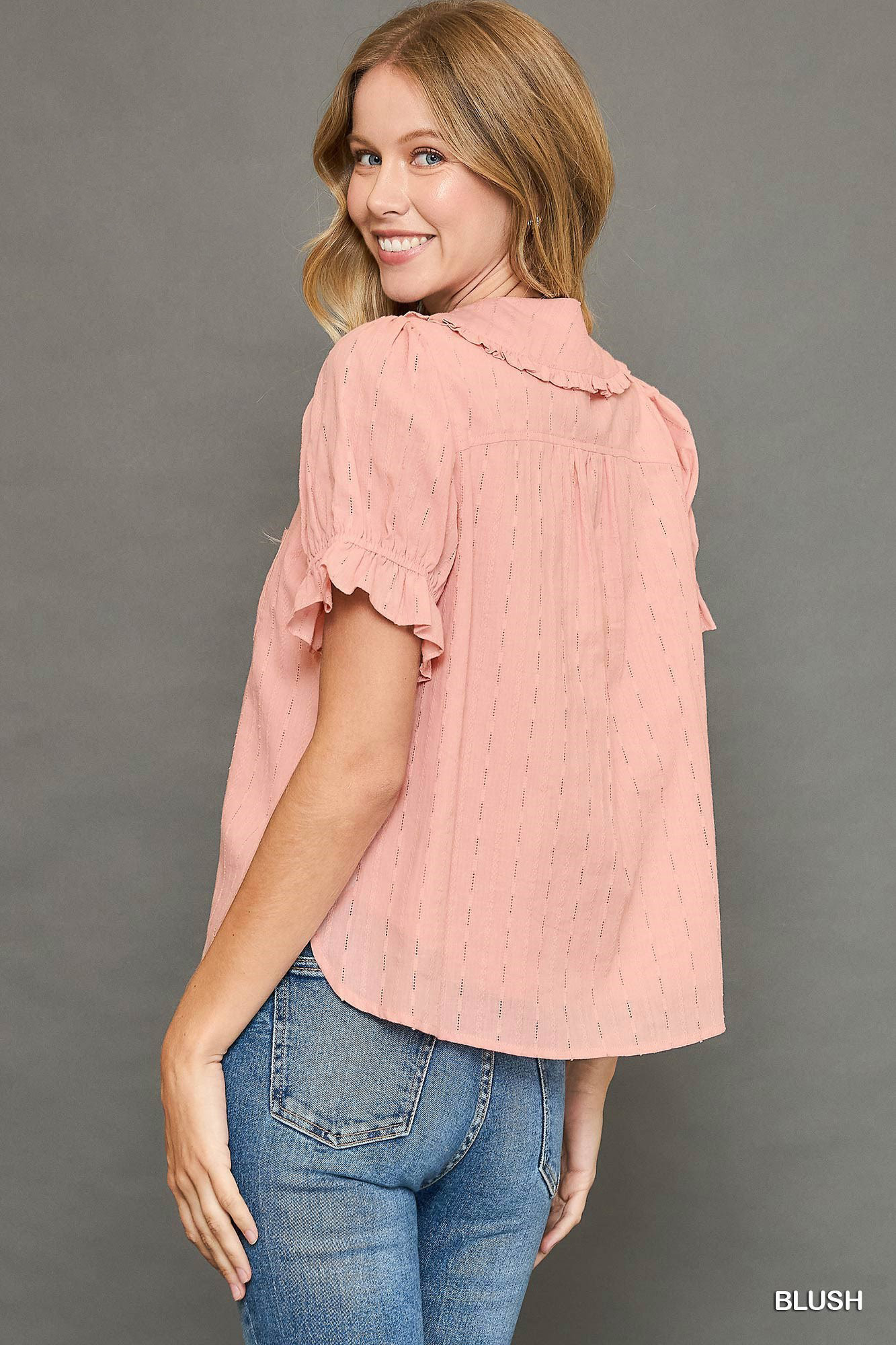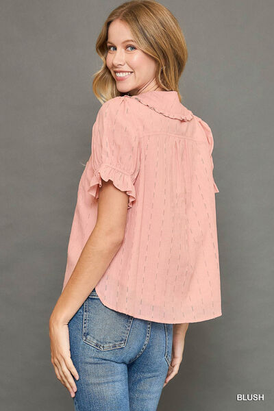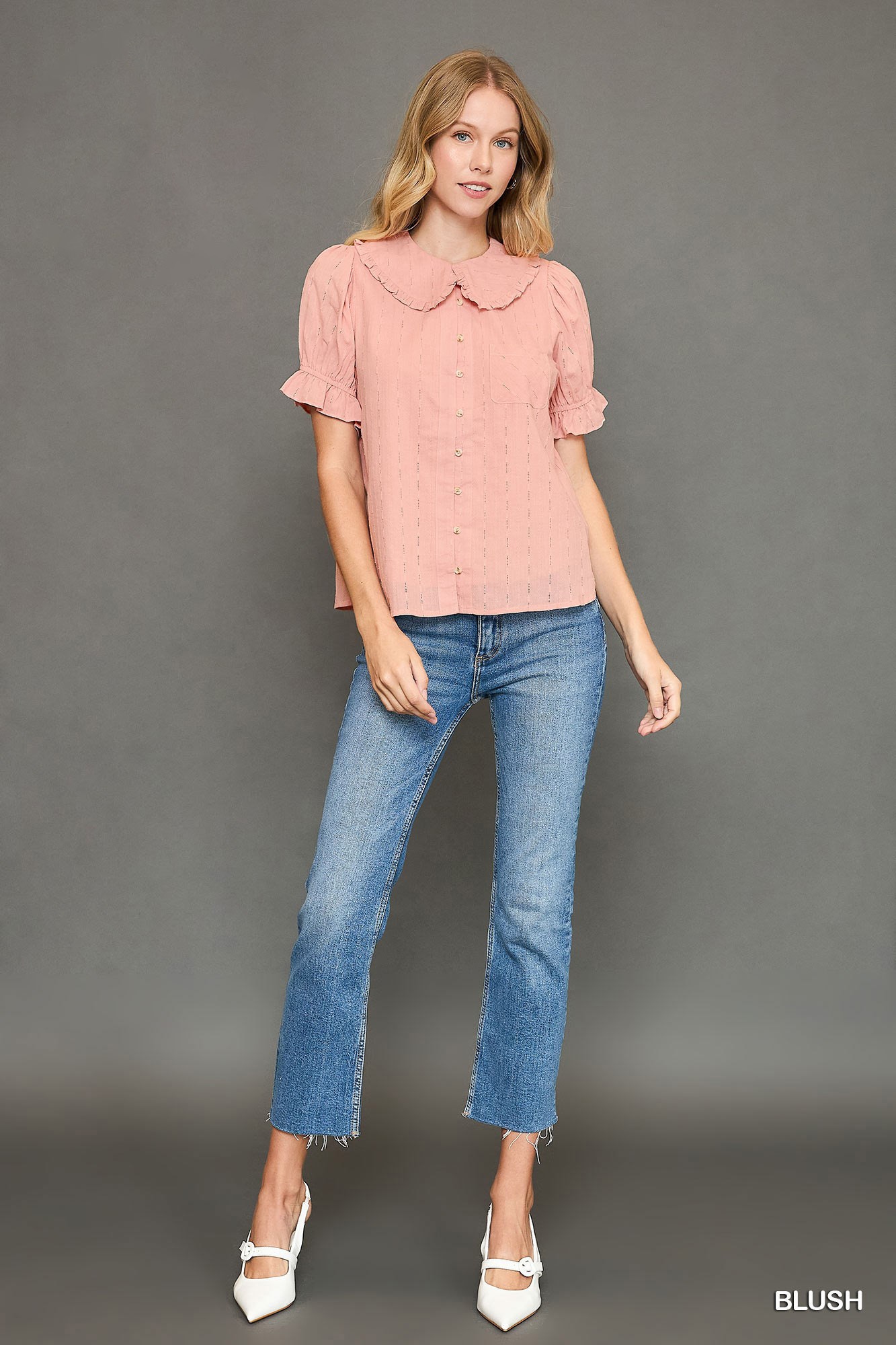 Peter Pan Collared Button Down Textured Shirt with Ruffled Detail