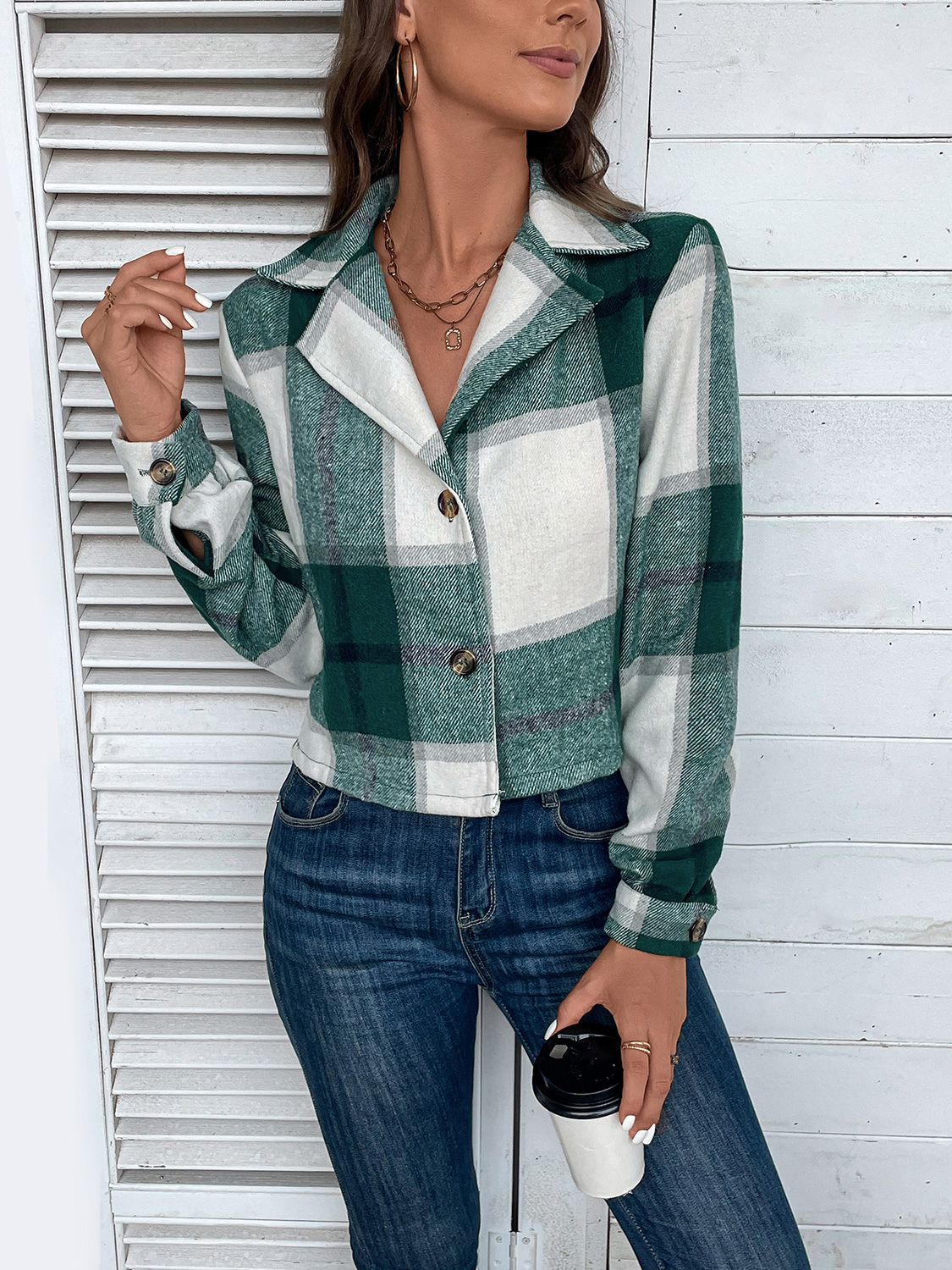Plaid Collared Neck Button Up Long Sleeve Jacket