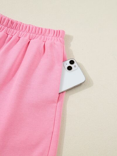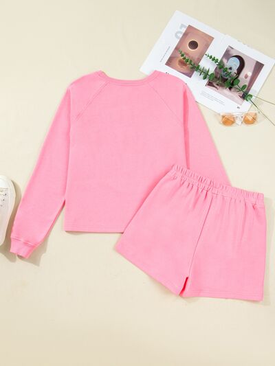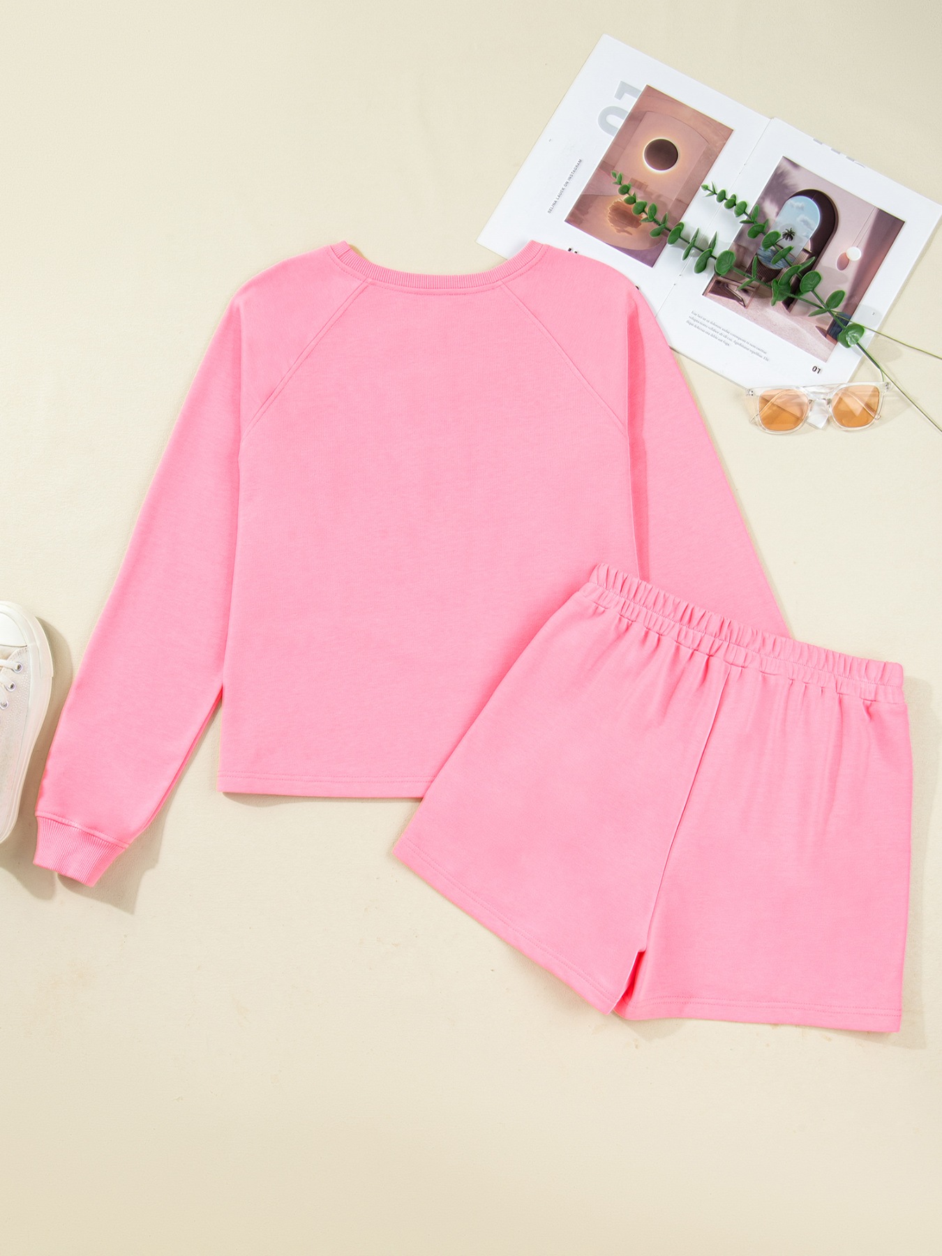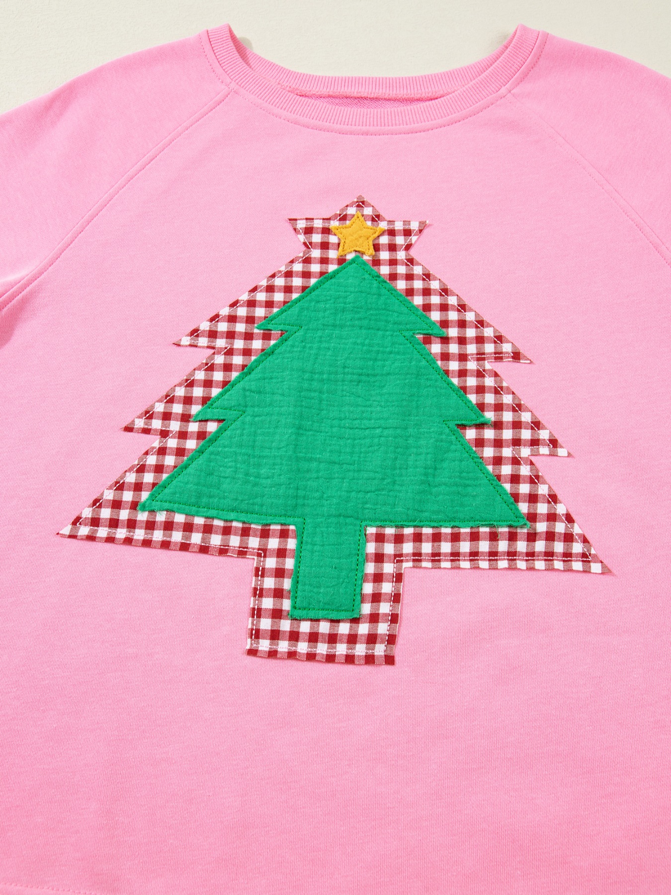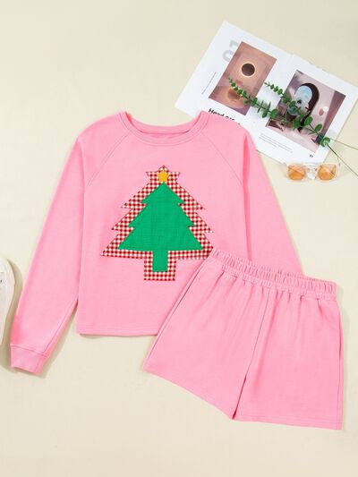 Plaid Contrasted Double Christmas Tree Patched Raglan Sleeve Pullover 2pcs Short Set
