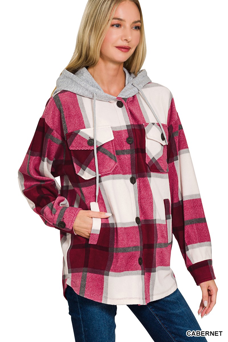 Plaid Drawstring Hooded Fleece Shacket