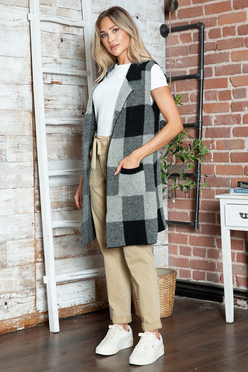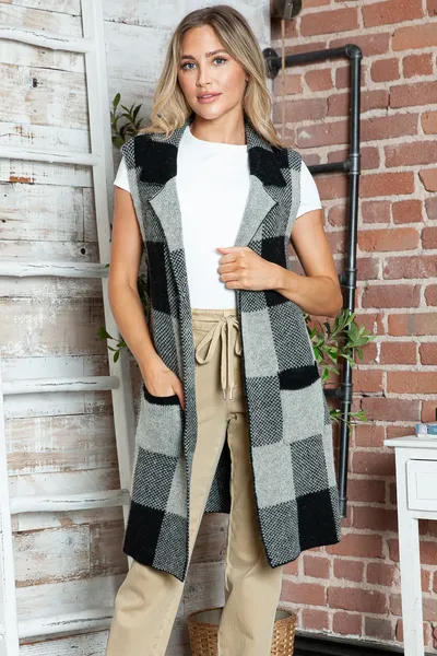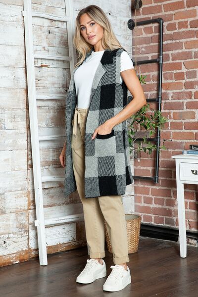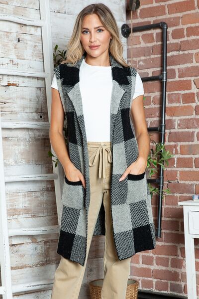 Plaid Lapel Collar Sleeveless Cardigan