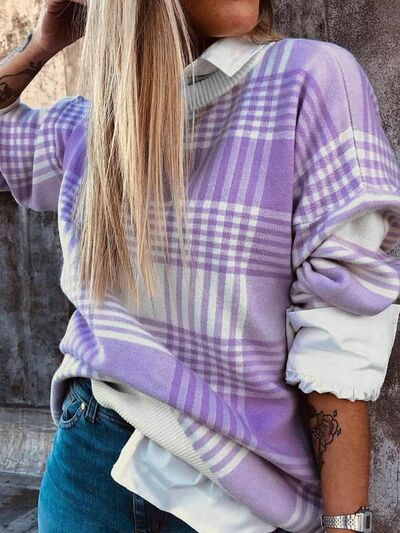 Plaid Round Neck Long Sleeve Sweater