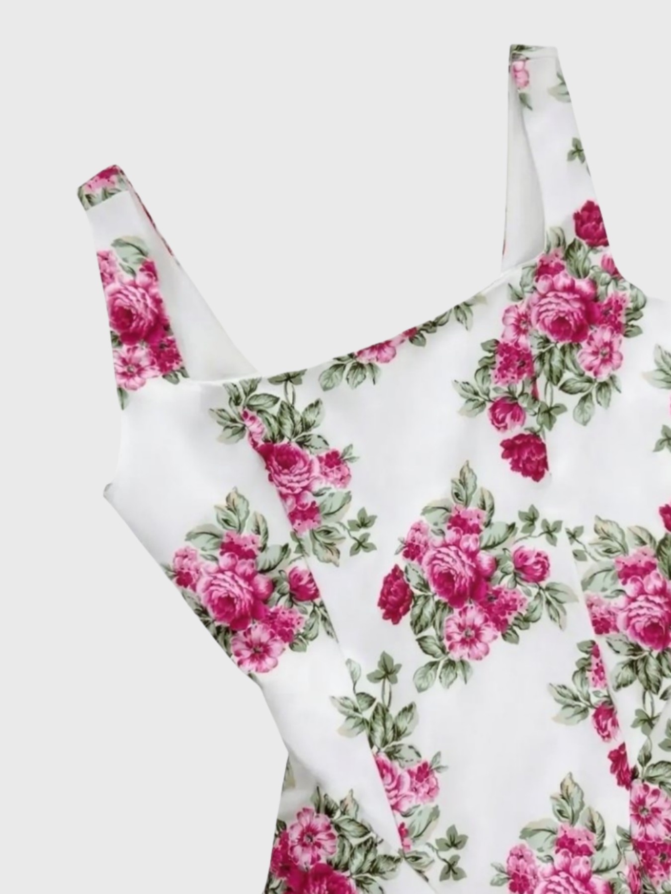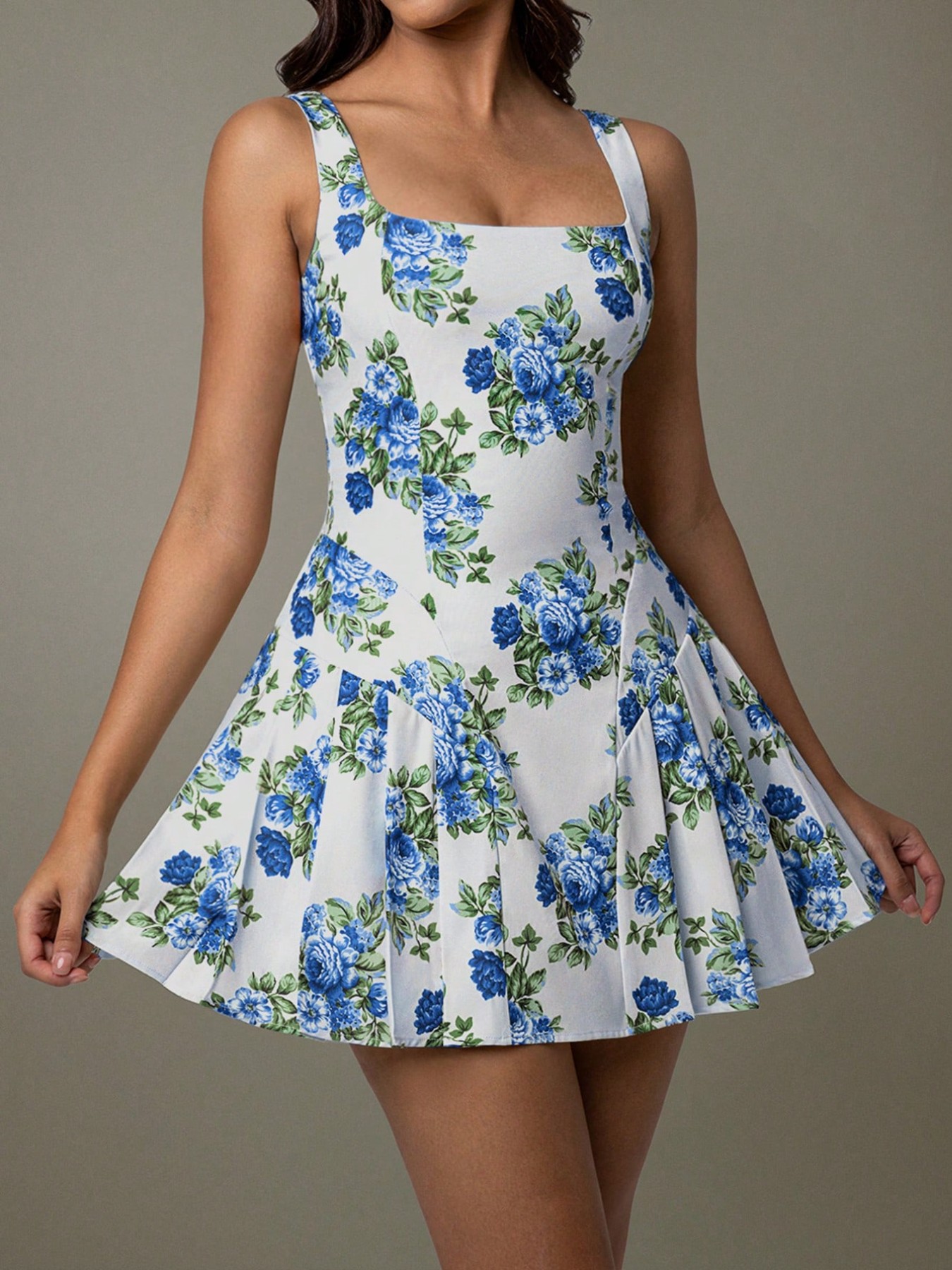 Pleated Floral Print Square Neck Mini Dress