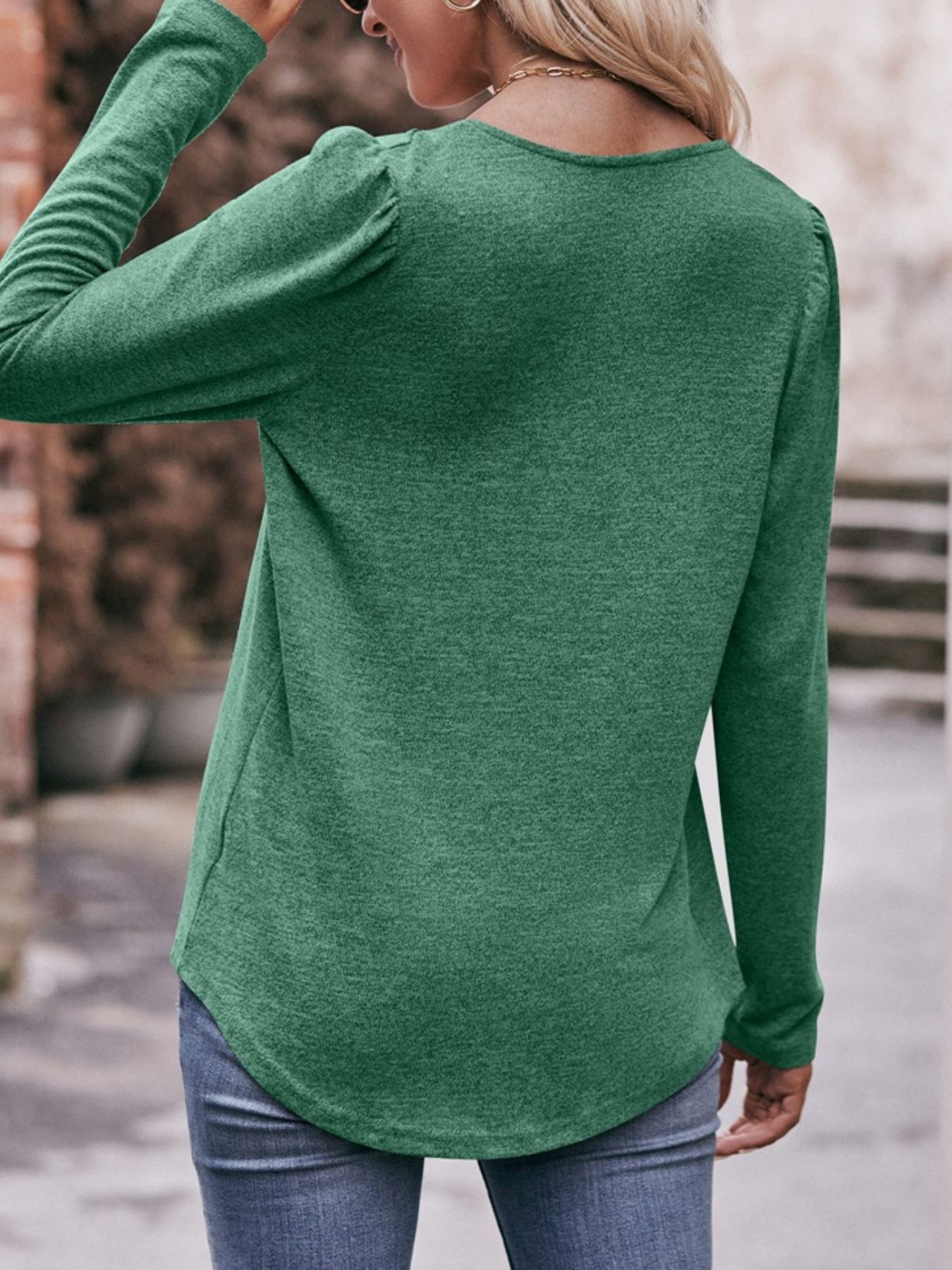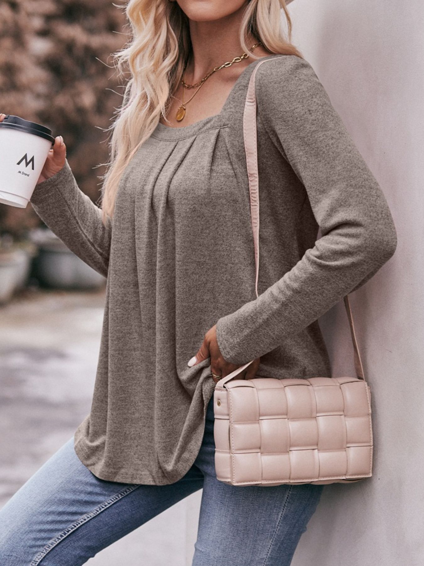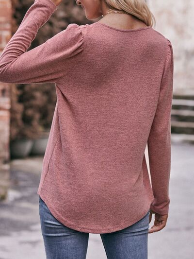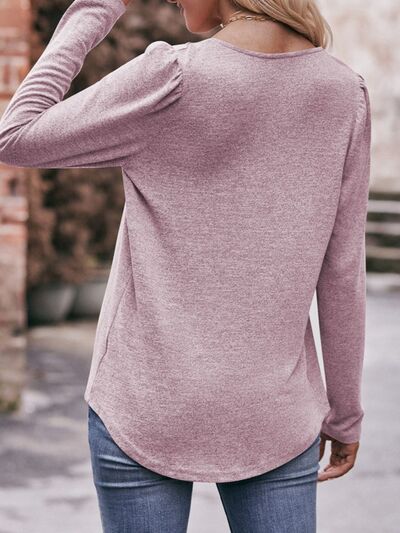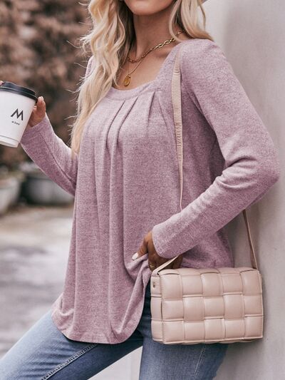 Pleated Square Neck Long Sleeve T-Shirt