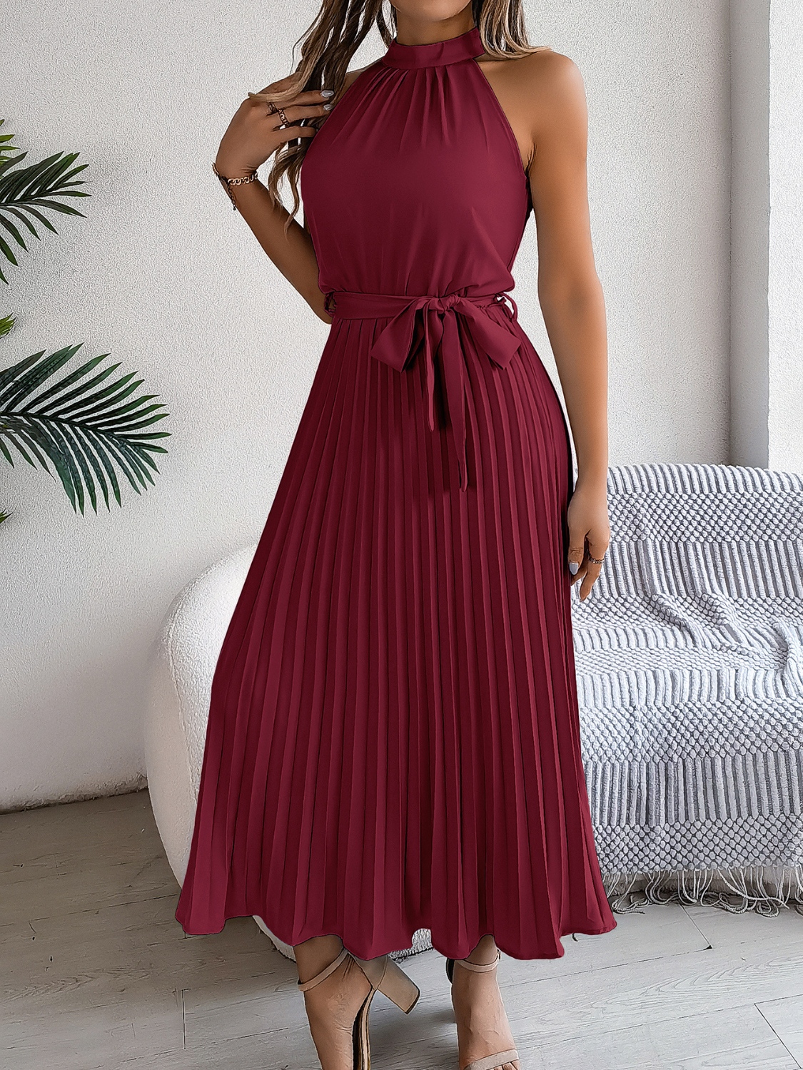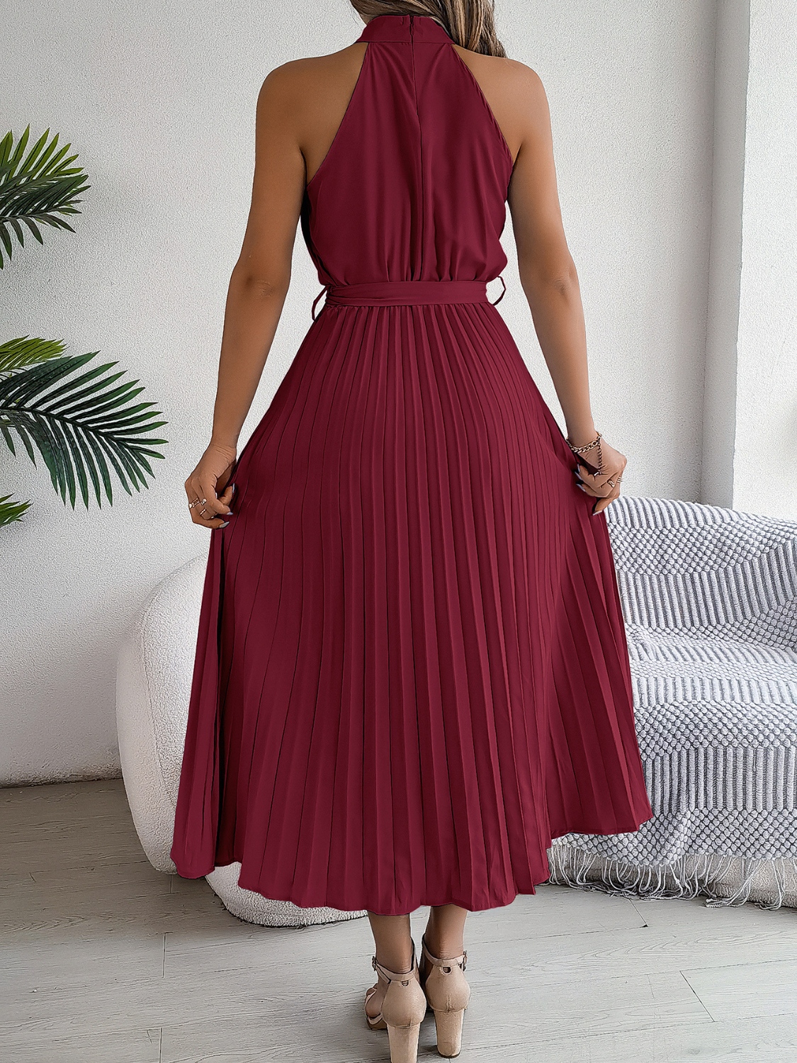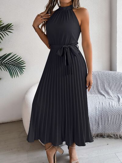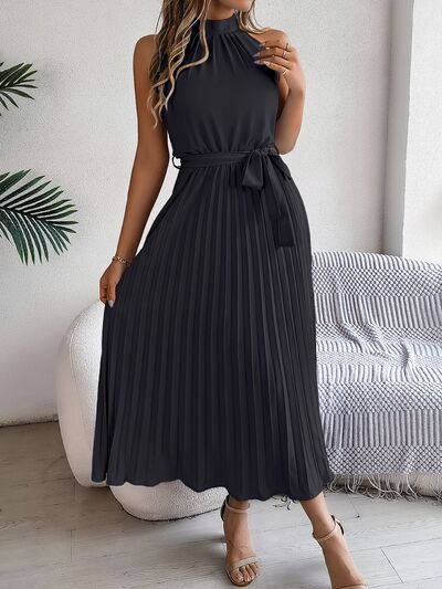 Pleated Tie Waist Sleeveless Midi Dress