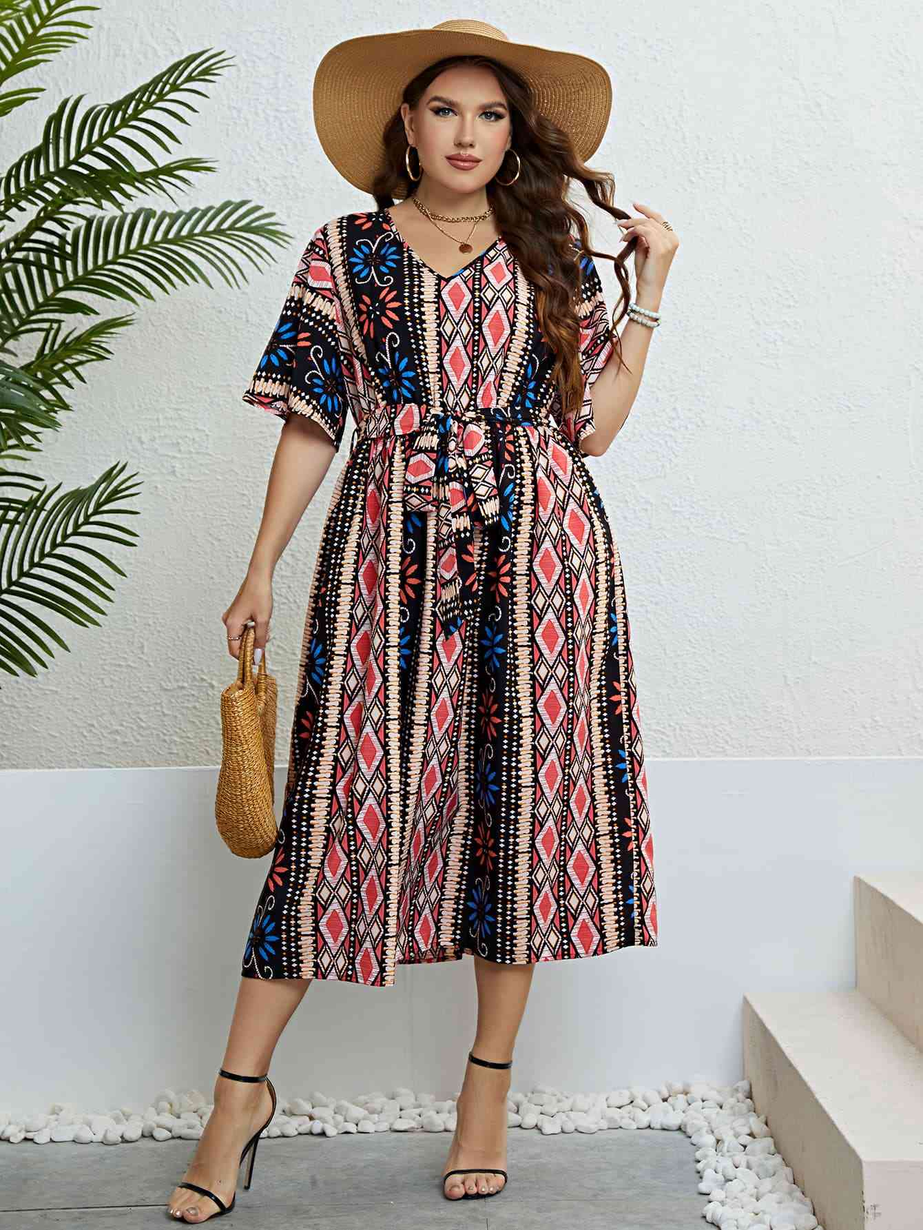 Plus Size Bohemian V-Neck Tie Belt Midi Dress