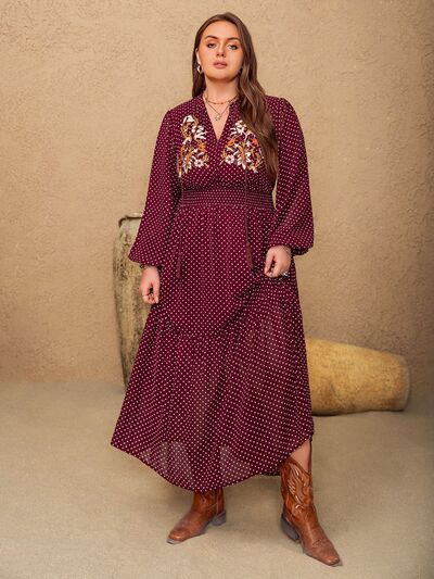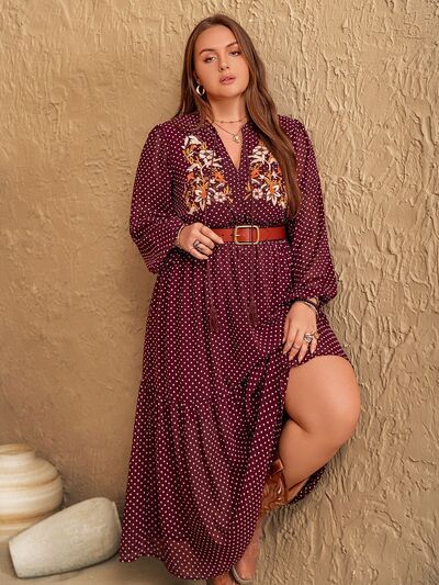 Plus Size Embroidered Polka Dot Tie Neck Long Sleeve Midi Dress