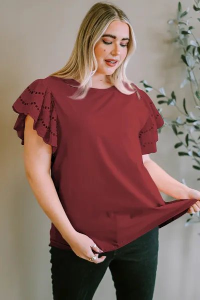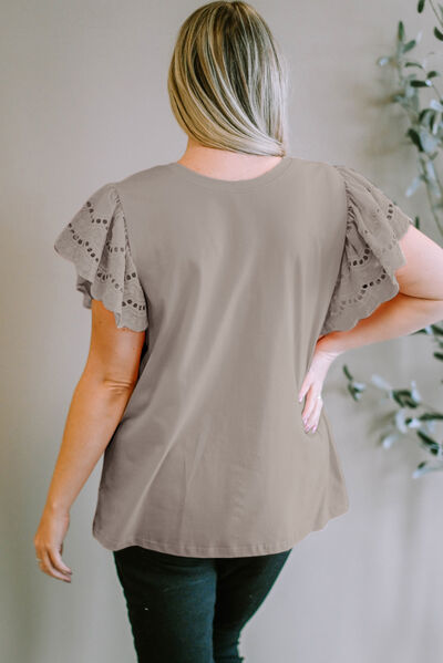 Plus Size Eyelet Round Neck Short Sleeve Blouse