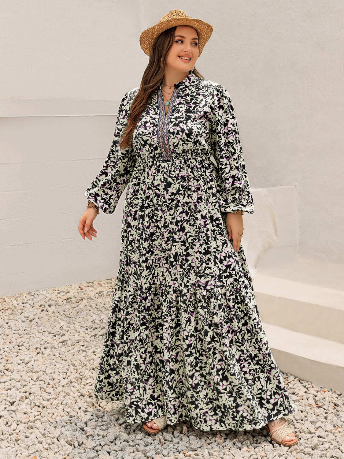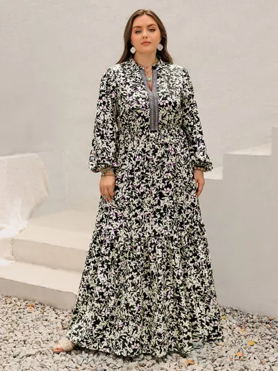 Plus Size Floral Print Long Sleeve Tiered Maxi Dress