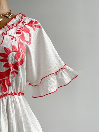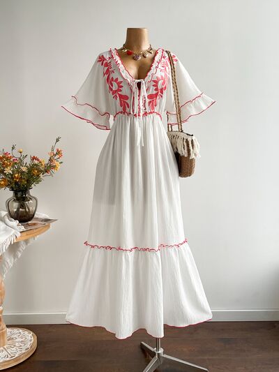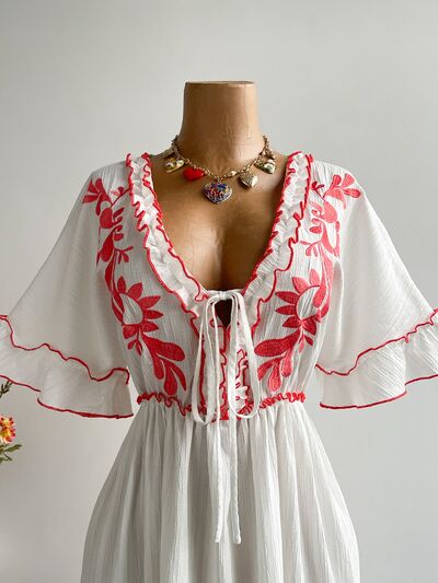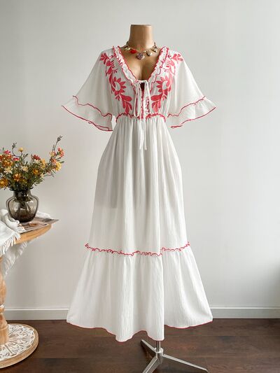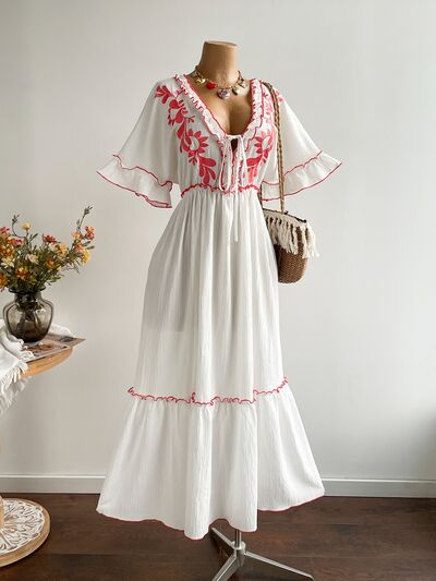 Plus Size Front Tie Maxi Dress with Floral Embroidered