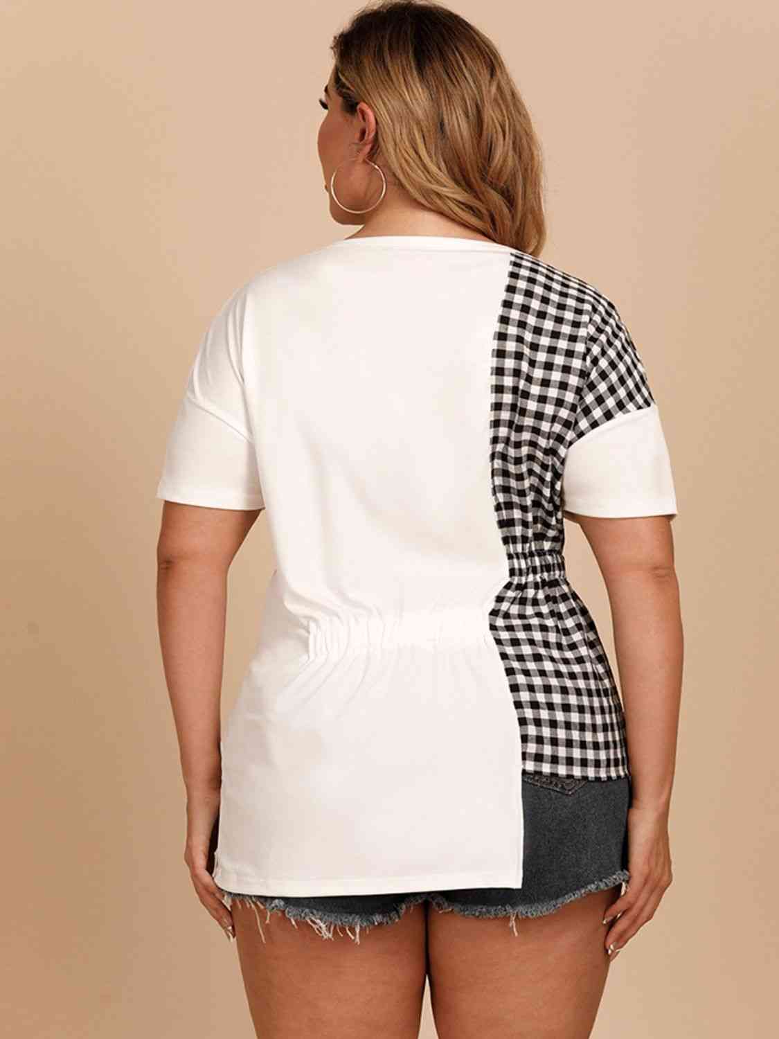 Plus Size Gingham Color Block Asymmetrical T-Shirt