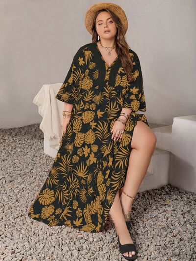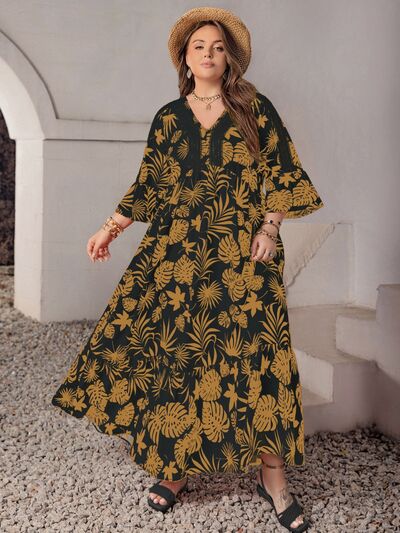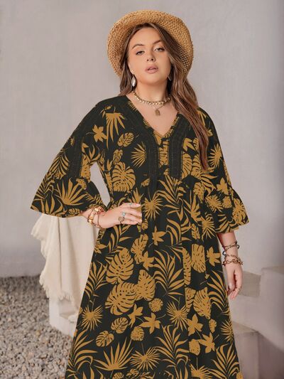 Plus Size Lace Detail Tropical Print Three-Quarter Sleeve Maxi Dress