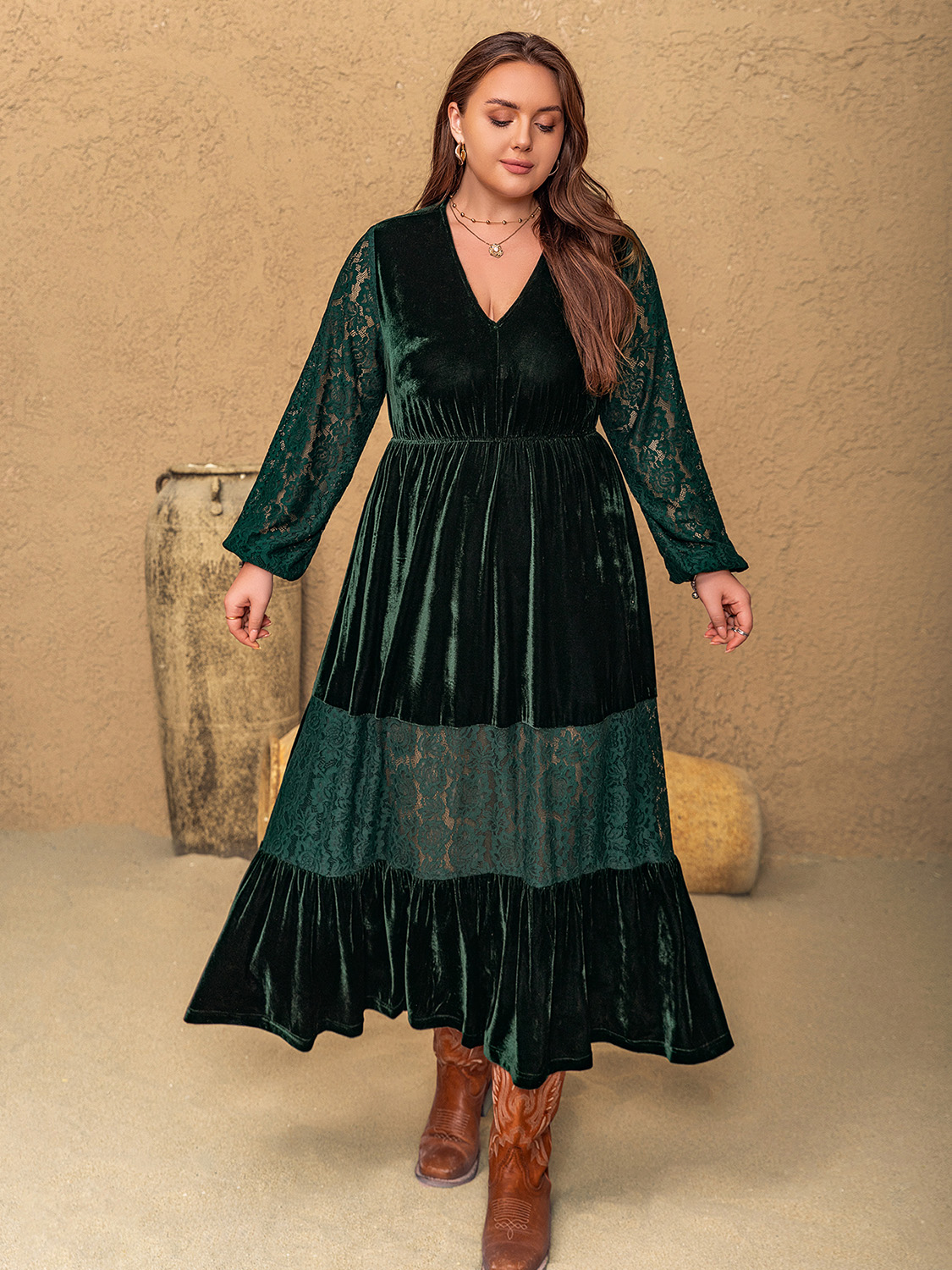 Plus Size Lace Patchwork V-Neck Balloon Sleeve Midi Dress