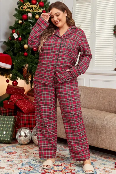 Plus Size Plaid Collared Neck Top and Pants Lounge Set