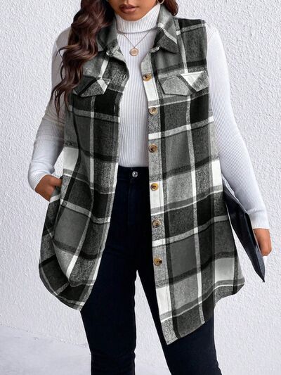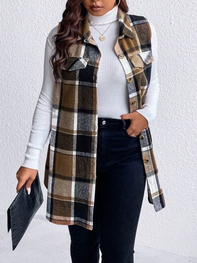 Plus Size Pocketed Plaid Button Up Vest Coat