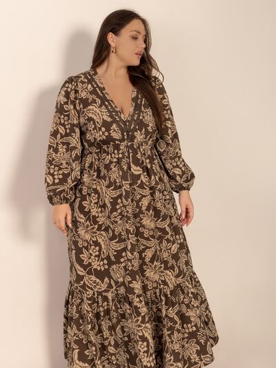 Plus Size Printed V-Neck Balloon Sleeve Maxi Dress