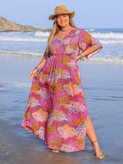 Plus Size Printed V-Neck Half Sleeve Maxi Dress