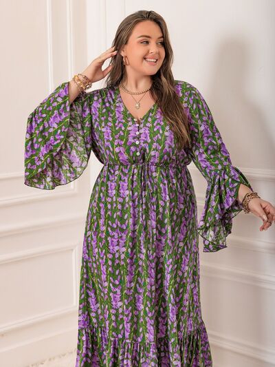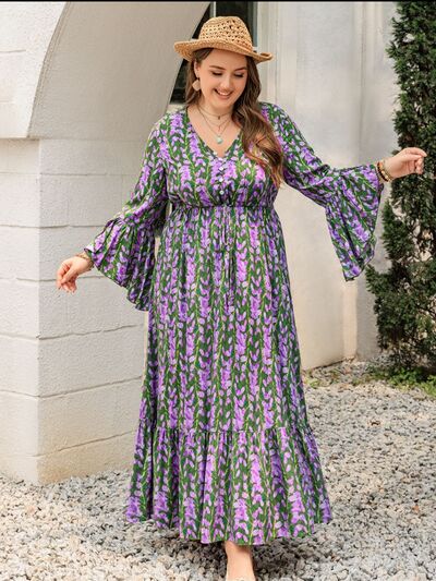 Plus Size Printed V-Neck Long Sleeve Maxi Dress