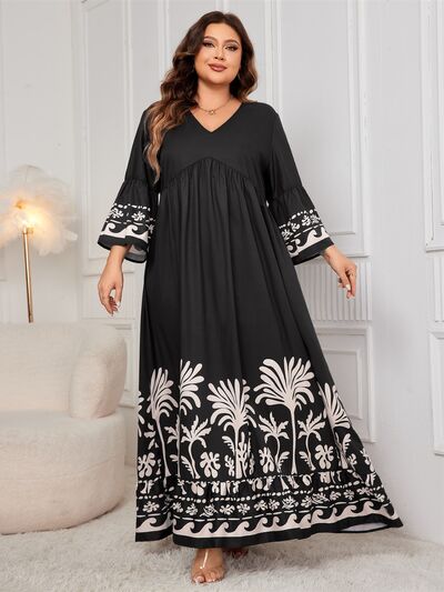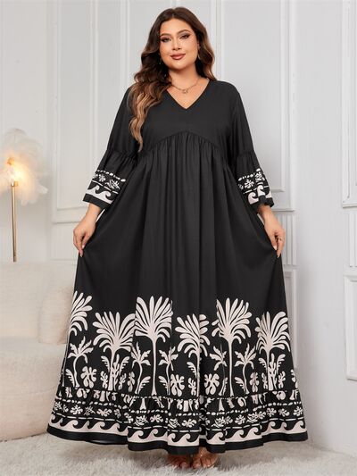 Plus Size Printed V-Neck Long Sleeve Maxi Dress