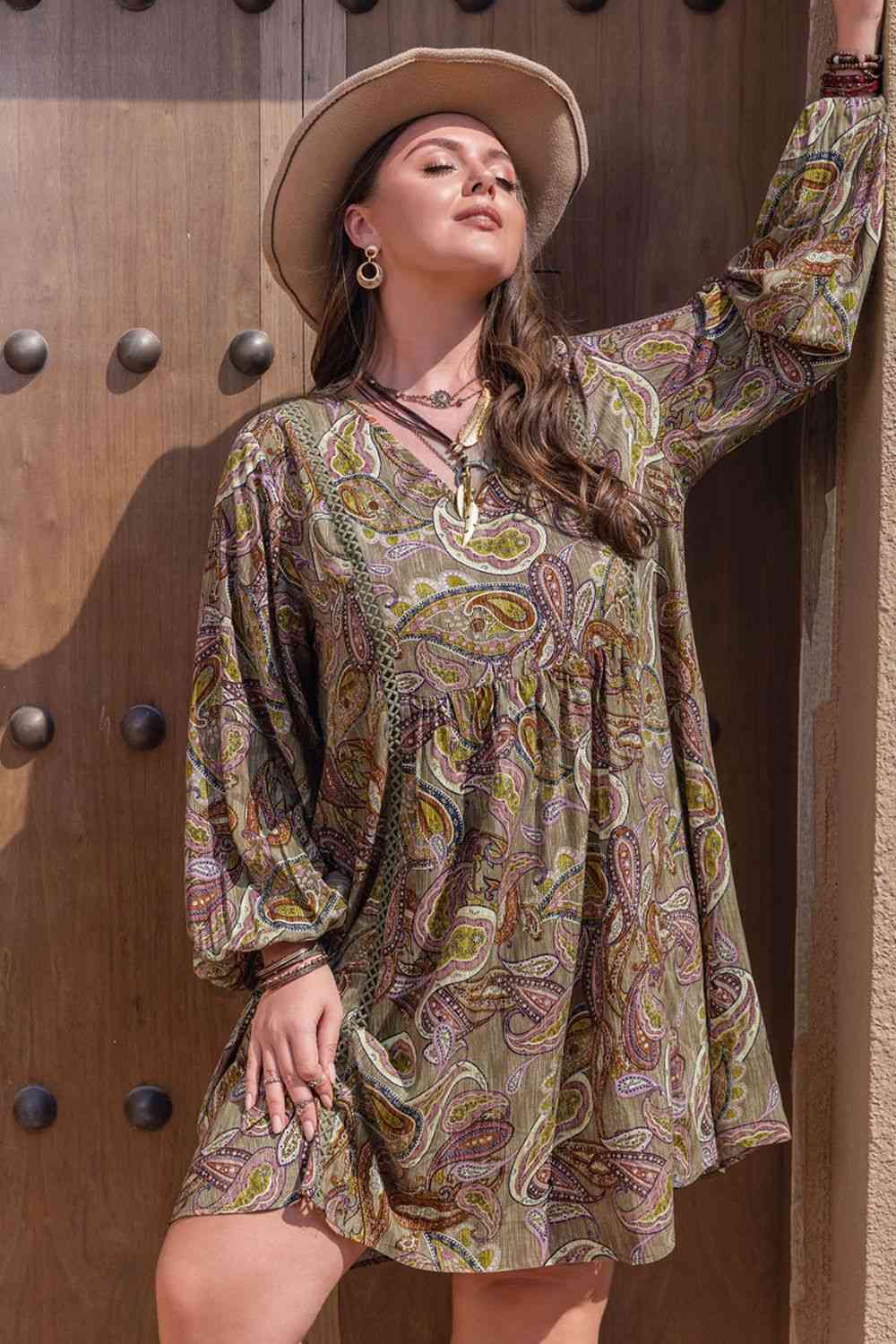 Plus Size Printed V-Neck Long Sleeve Midi Dress