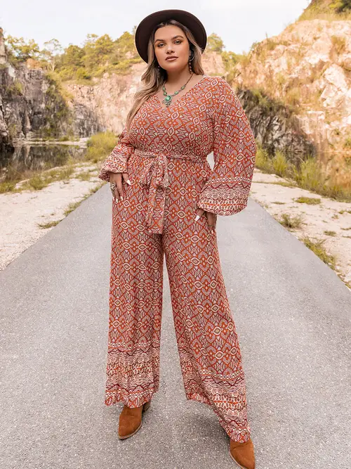 Plus Size Printed V-Neck Tie Front Balloon Sleeve Jumpsuit