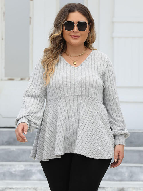 Plus Size Ribbed V-Neck Long Sleeve Blouse