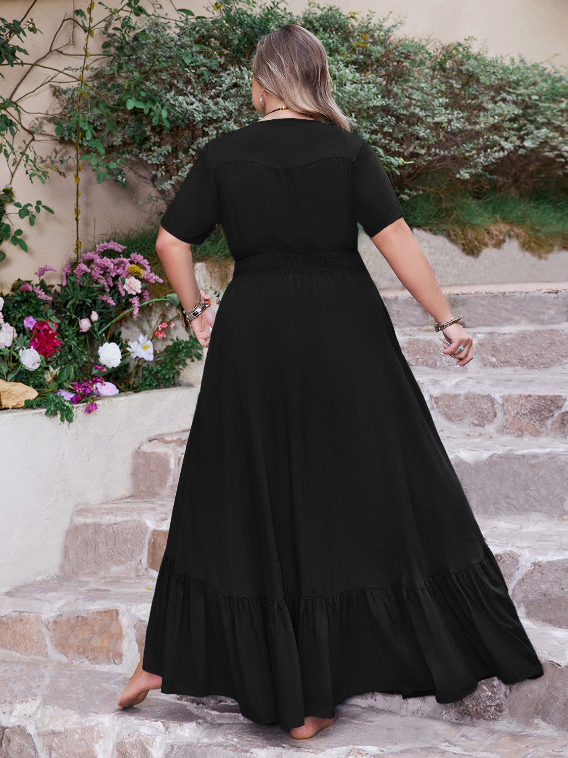 Plus Size Ruffled Hem Button Down V-Neck Short Sleeve Maxi Dress