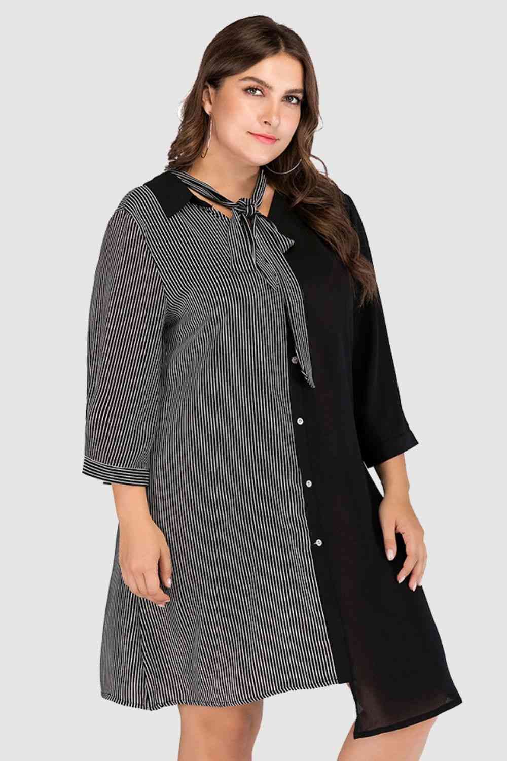 Plus Size Striped Color Block Tie-Neck Dress