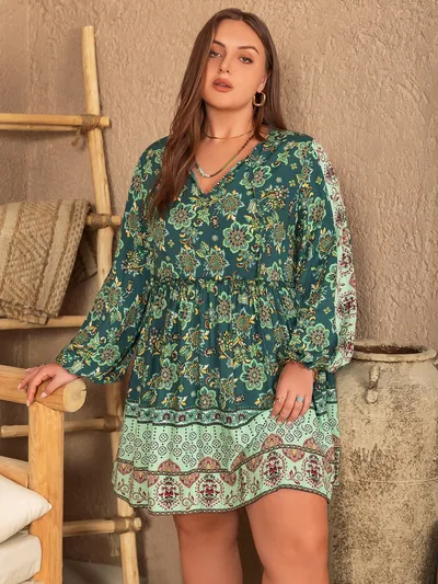Plus Size V-Neck Balloon Sleeve Printed Mini Dress