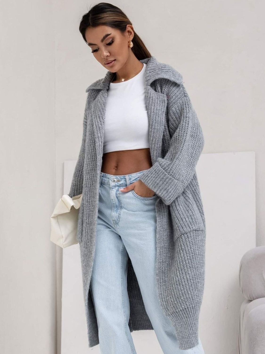 Pocketed Collared Neck Dropped Shoulder Cardigan