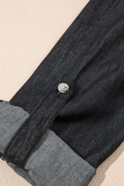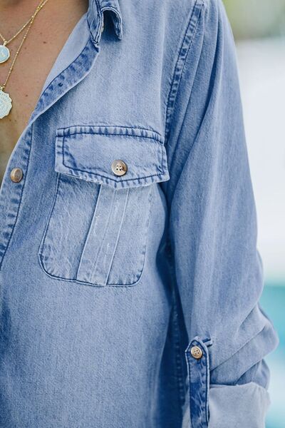 Pocketed Collared Neck Long Sleeve Denim Top