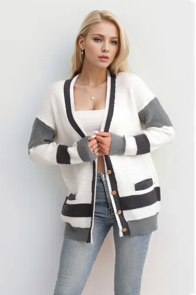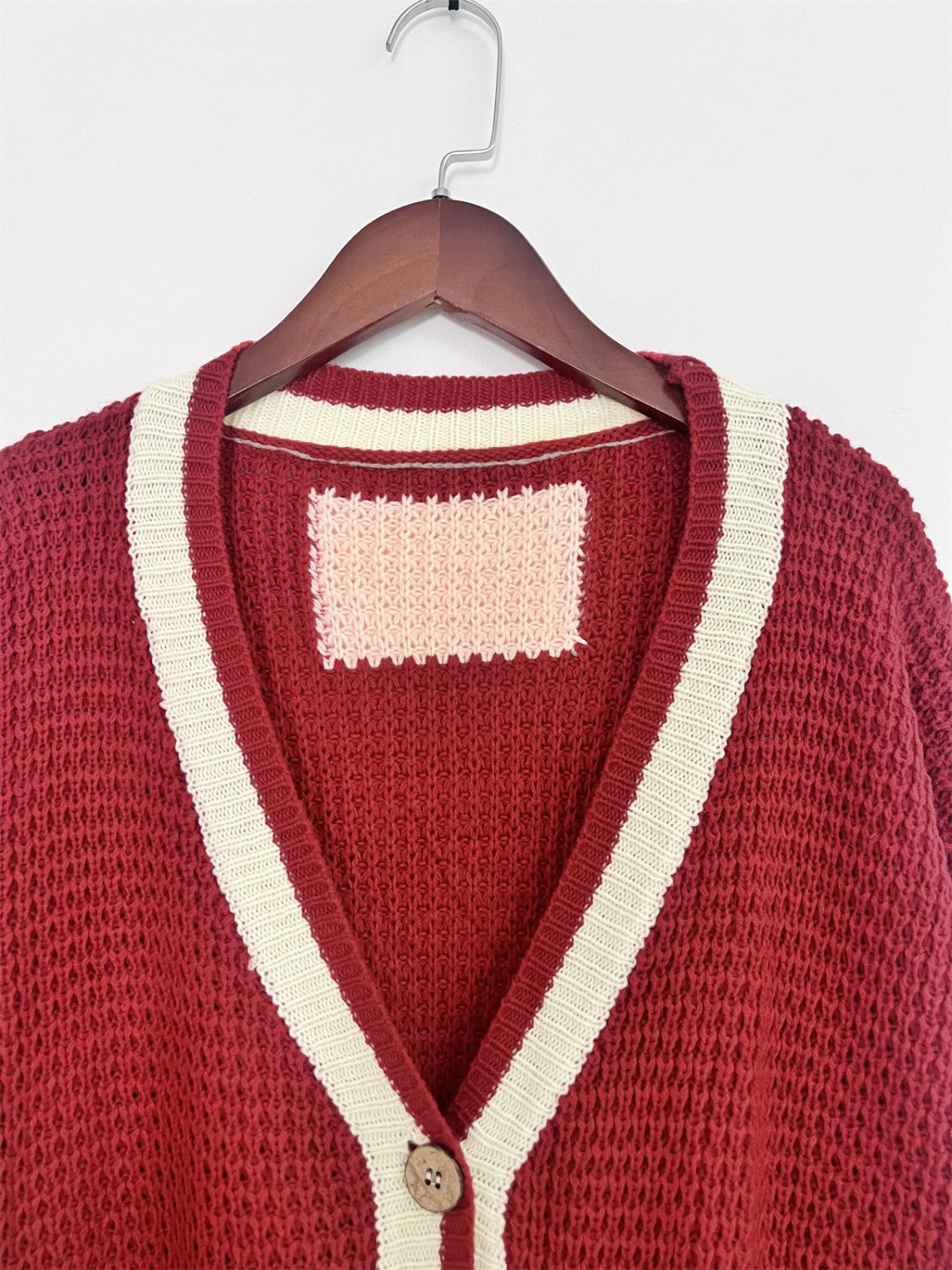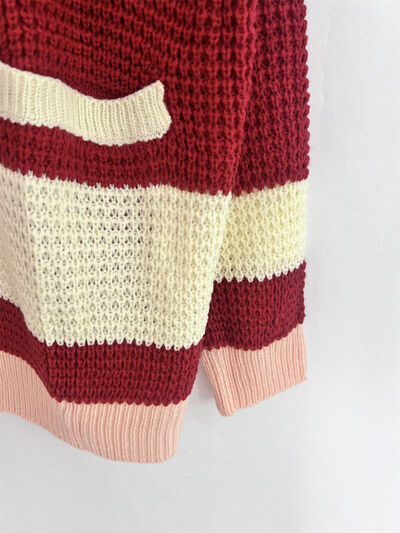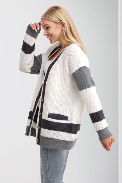 Pocketed Contrast V-Neck Long Sleeve Cardigan