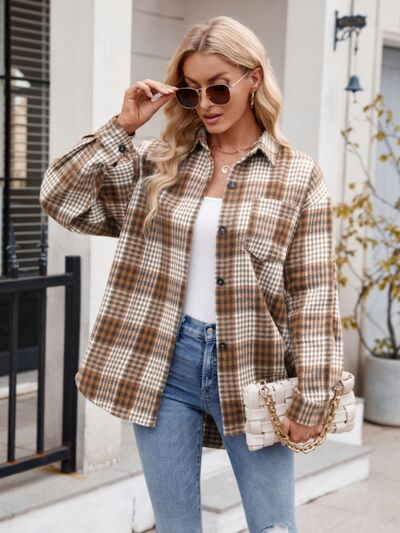 Pocketed Plaid Collared Neck Long Sleeve Shirt