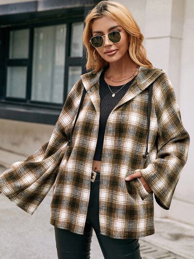 Pocketed Plaid Long Sleeve Hooded Jacket