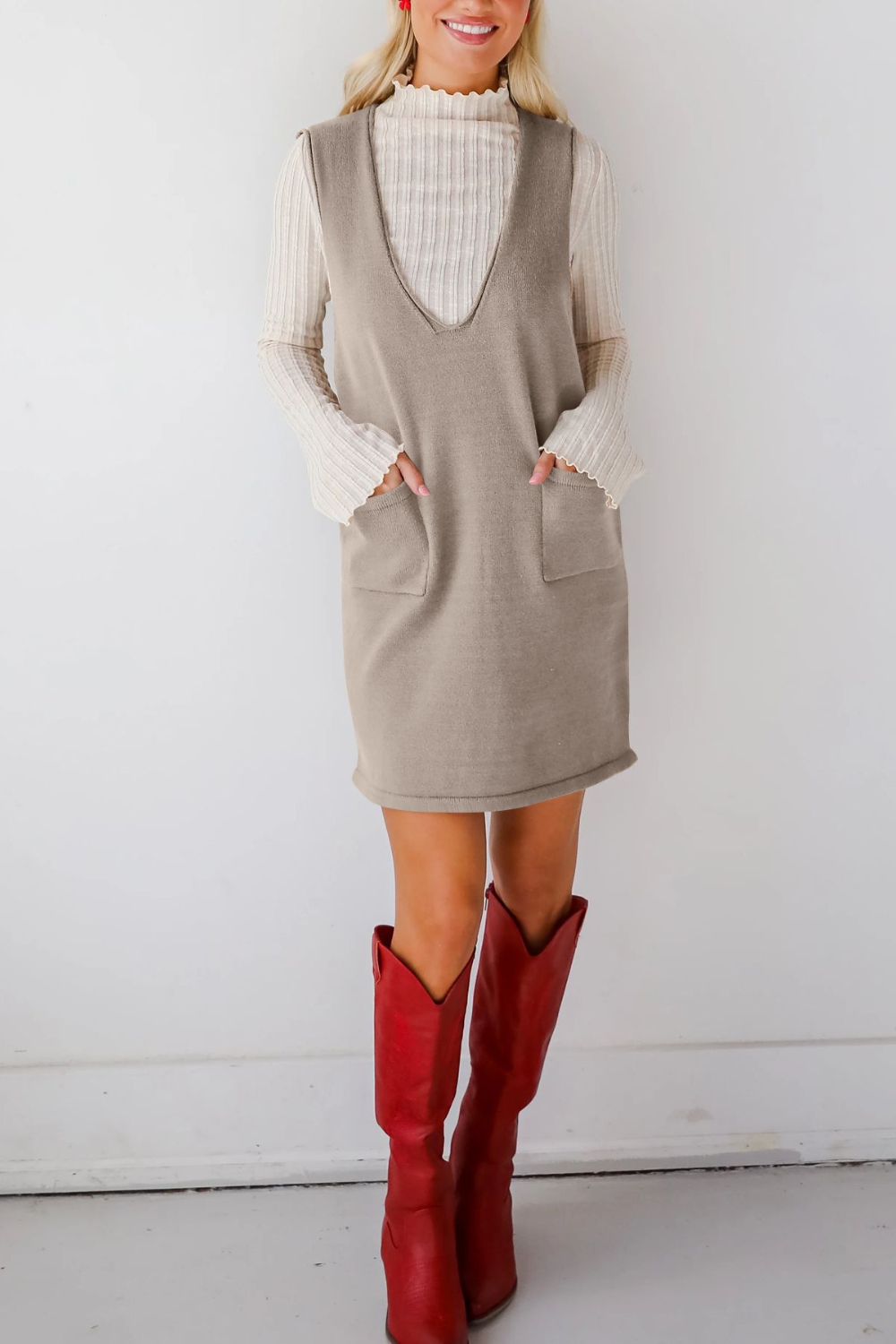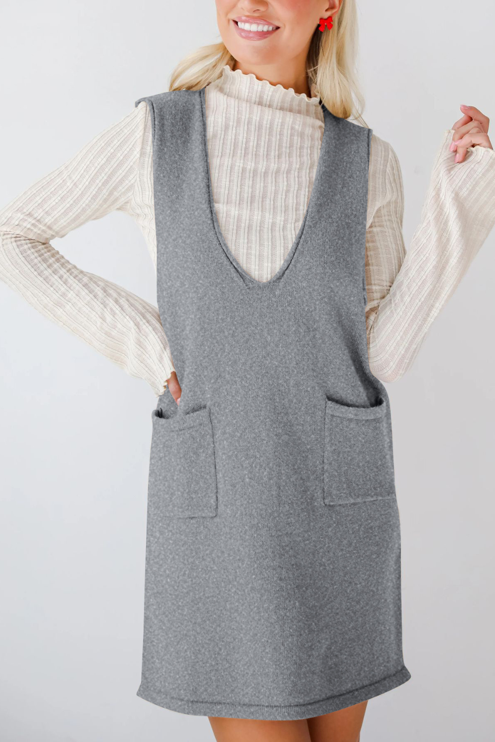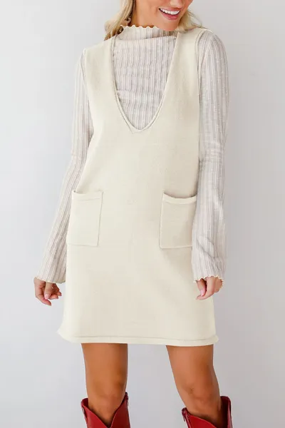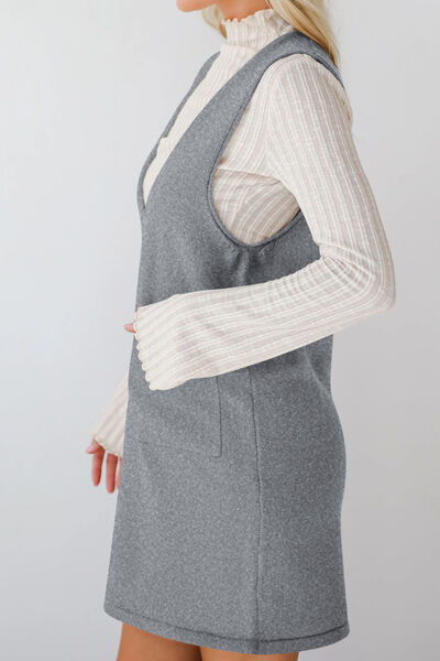 Pocketed V-Neck Mini Sweater Overall Dress