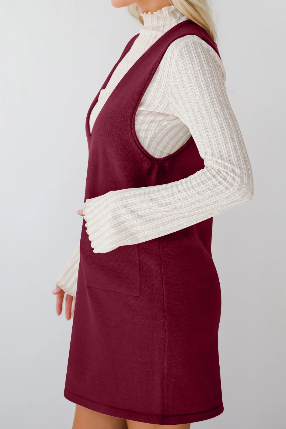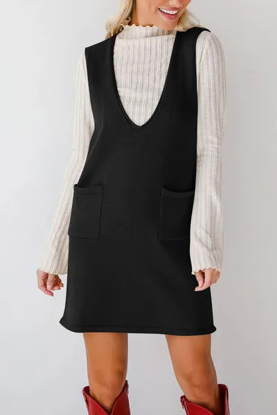Pocketed V-Neck Mini Sweater Overall Dress