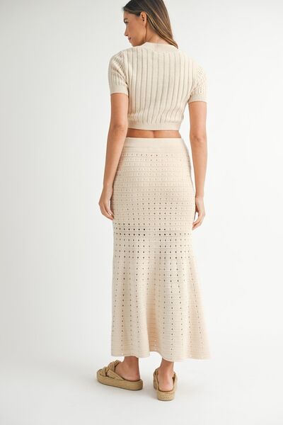 Pointelle Short Sleeve Crop Top and Slit Skirt Sweater Set