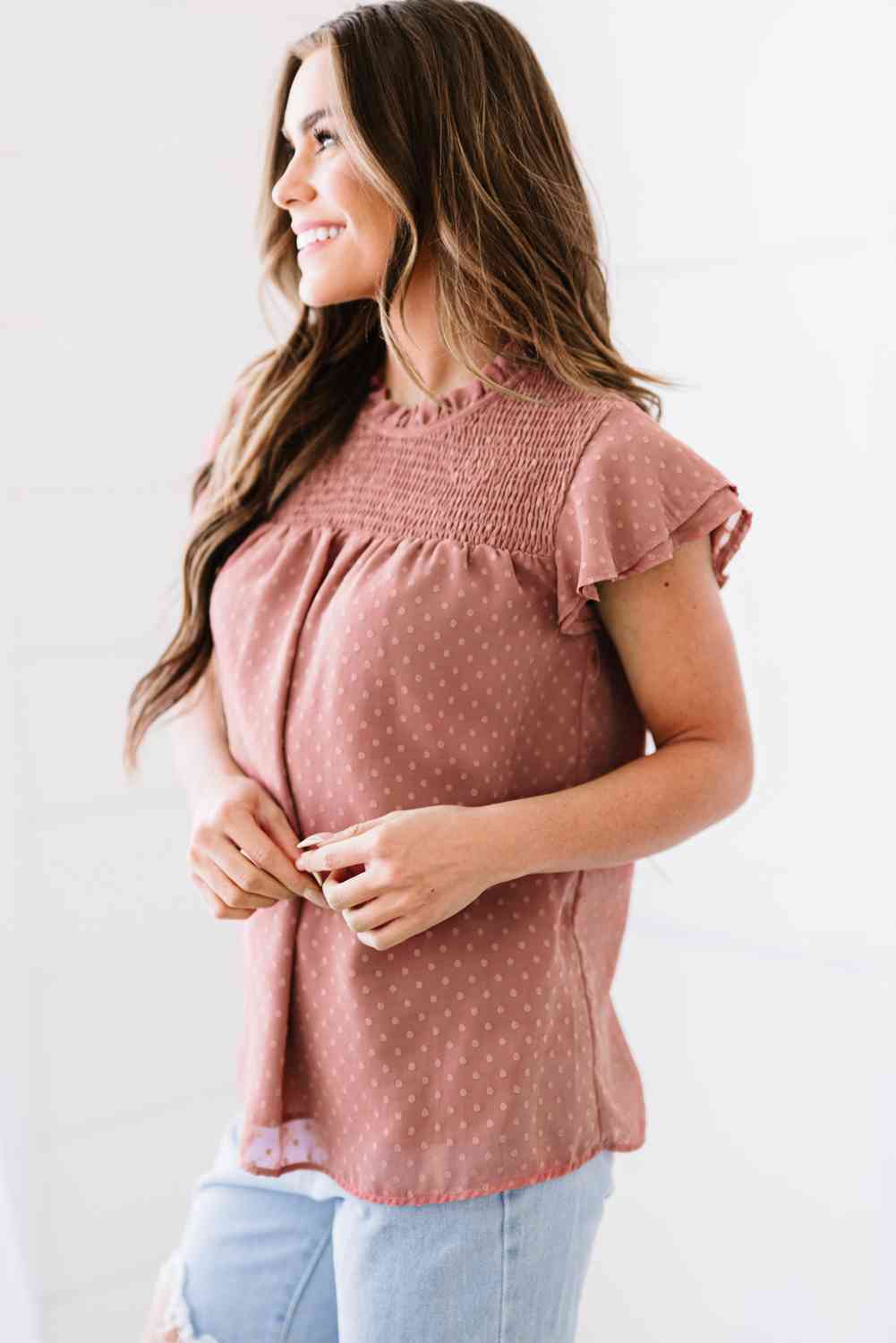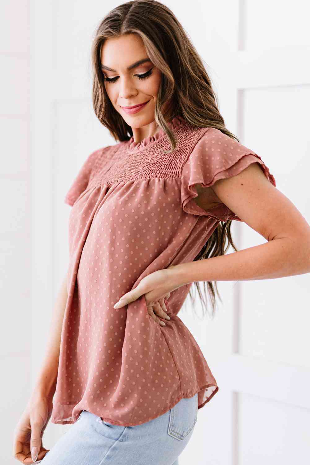 Polka Dot Smocked Flutter Sleeve Blouse