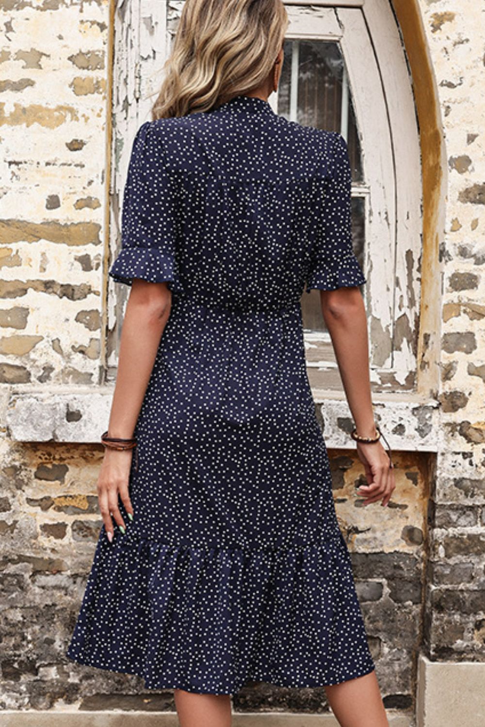 Polka Dot Tie Front Ruffled Midi Dress