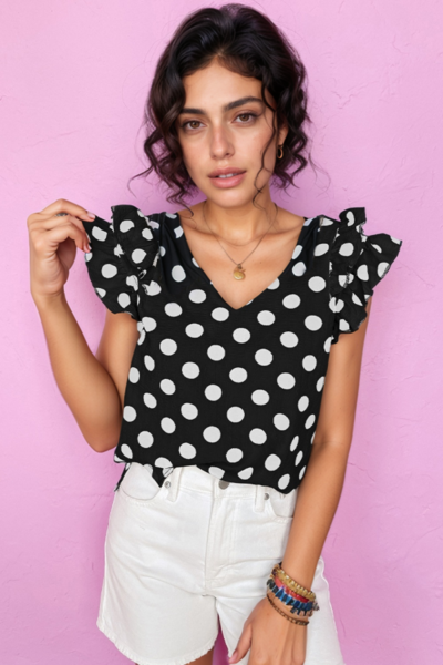 Polka Dot V-Neck Ruffle Cap Sleeve Blouse