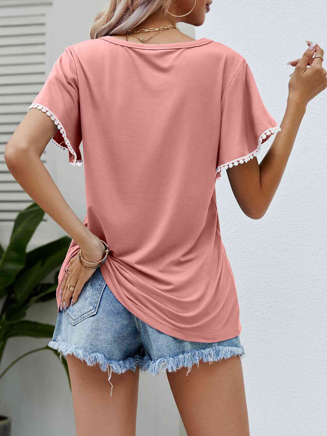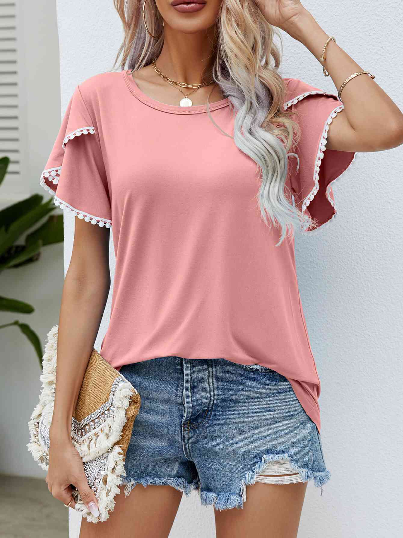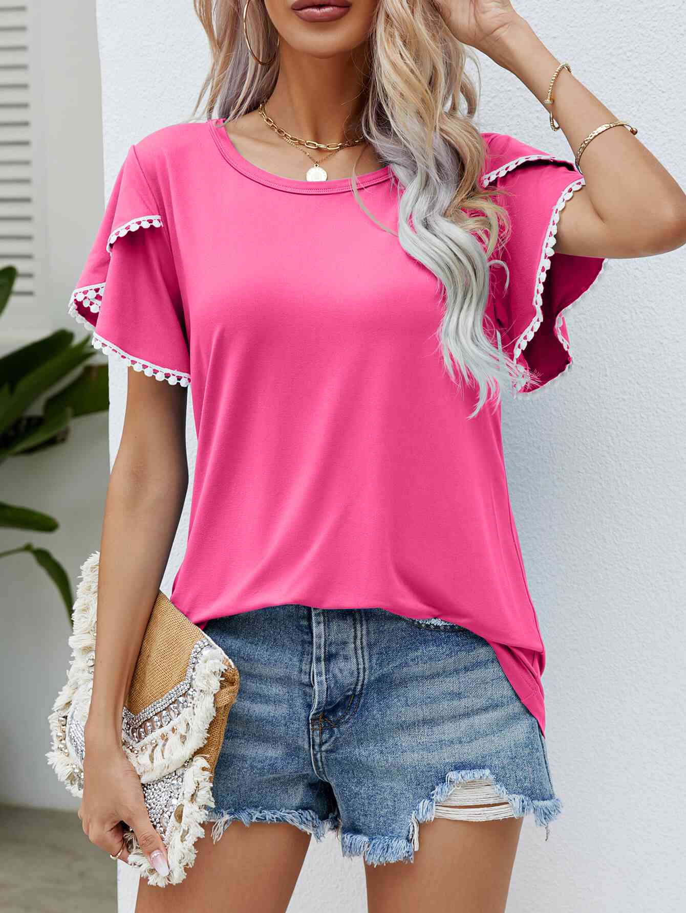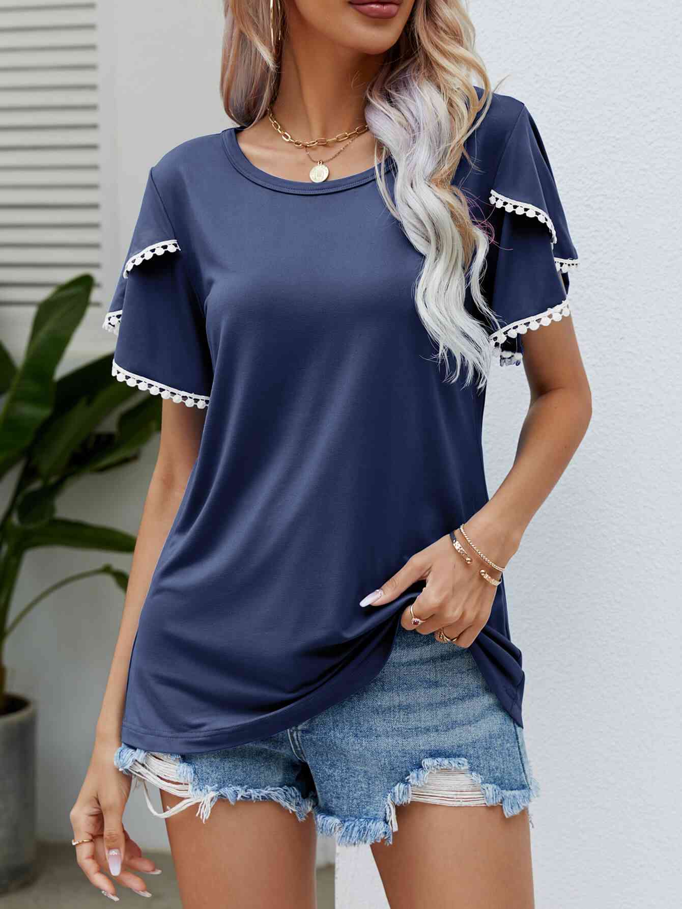 Pom-Pom Trim Flutter Sleeve Round Neck Tee