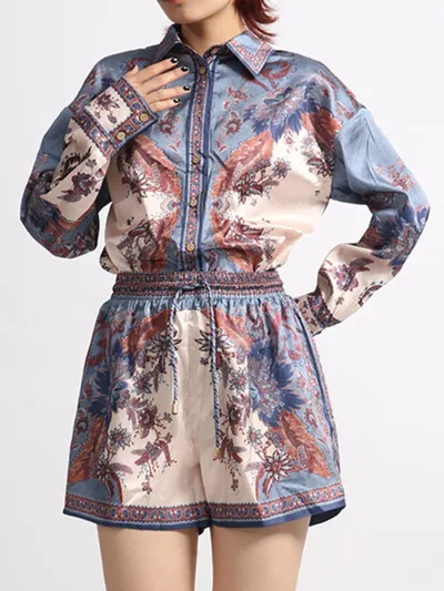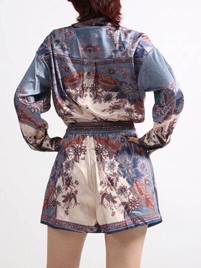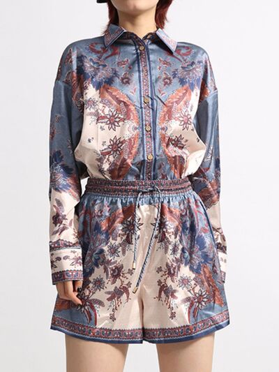 Printed Button Front Long Sleeve Shirt and Shorts Set