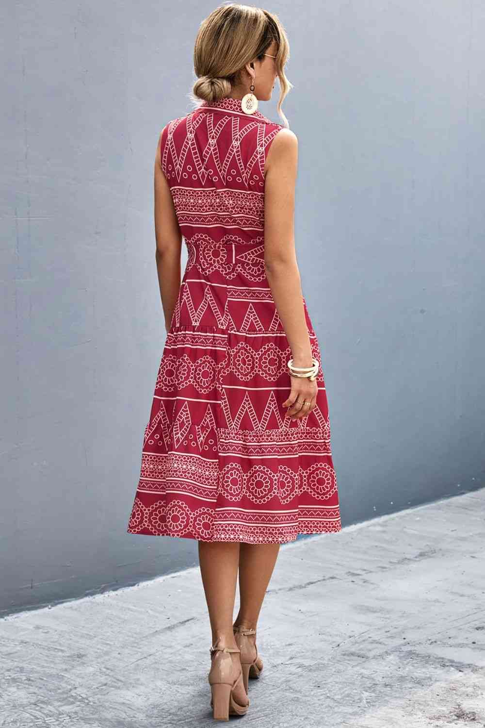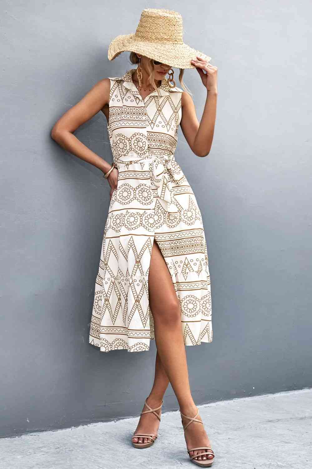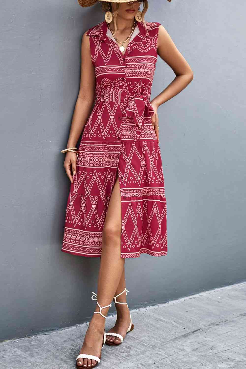 Printed Button Front Tie-Waist Sleeveless Collared Dress