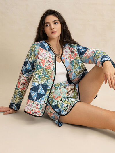 Printed Button Up Long Sleeve Outerwear and Shorts Set