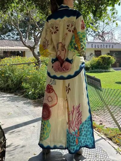 Printed Collared Neck Shirt and Wide Leg Pants Set