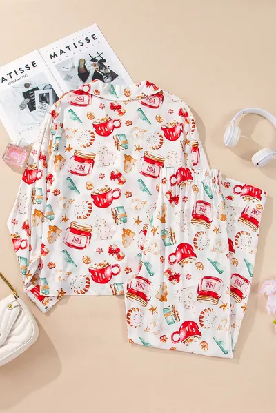 Printed Collared Neck Top and Pants Lounge Set