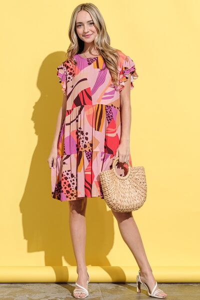 Printed Double Ruffles Sleeve Dress